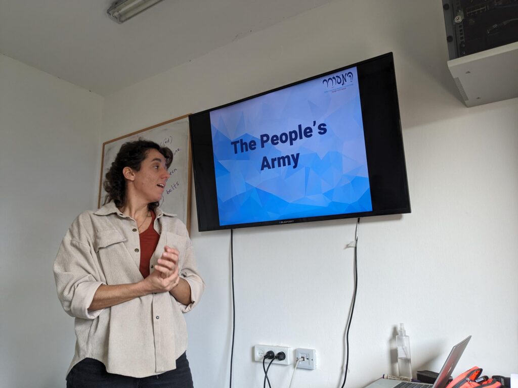 After lunch we had a fruitful discussion with Lee Hacham, who came to us all the way from Akko to discuss aspects of the current situation in Israel. We learned about the IDF’s ethics policies and how those tensions are addressed during times of war.