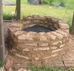 Our next step was building. We were fortunate enough to have access to leftover cob bricks. Our farm & stewardship team had made these bricks in 2022 for the amphitheater that’s currently being built next to our lake. We used these bricks to form the perimeter of the oven with our cob mixture serving as mortar. We placed cob down, laid a brick on top, and filled any gaps with more cob. Sometimes we would need to use a garden tool to chip away parts of the brick so that we could form the curve of the oven, which you can see in the picture to the right.